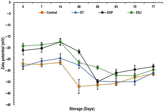 Zeta potential (mV) of emulsions with propolis extract, during storage for 77 days at 4 °C. ET = emulsion with propolis extract from Teotitlán de Flores Magón, ESP = emulsion with propolis extract from San Pedro Ocopetatillo, ESJ = emulsion with propolis extract from San Jerónimo Tecoalt.