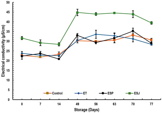 Electrical conductivity (µS/cm) of emulsions with propolis extract, during storage for 77 days at 4 °C. ET = emulsion with propolis extract from Teotitlán de Flores Magón, ESP = emulsion with propolis extract from San Pedro Ocopetatillo, ESJ = emulsion with propolis extract from San Jerónimo Tecoalt.