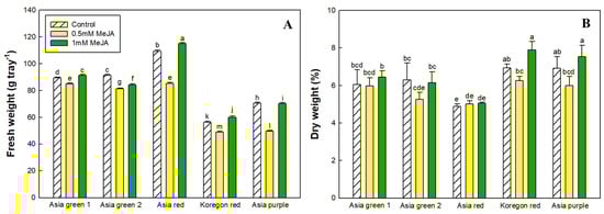 Similarly, the results of dry weight percentage in the control group ranged from 4.88% in ‘Asia red’ to 6.94% in ‘Koregon red’. Upon the application of 0.5 mM MeJA treatment to the microgreens, the dry weight percentages were 5.97, 5.25, 5.01, 6.25, and 5.99% for ‘Asia green 1’, ‘Asia green 2’, ‘Asia red’, ‘Koregon red’, and ‘Asia purple’, respectively. On the other hand, the dry weight percentages for 1.0 mM MeJA-treated microgreens were 6.44, 6.15, 5.04, 7.89, and 7.53% for ‘Asia green 1’, ‘Asia green 2’, ‘Asia red’, ‘Koregon red’, and ‘Asia purple’, respectively (Figure 1B). The results agree with the findings of Wojdyło et al. [32]. The high water content in ‘Asia red’ could be attributed to their advanced vegetative growth stage and their ability to store water effectively, as well as their adaptations to minimize water loss [32].
