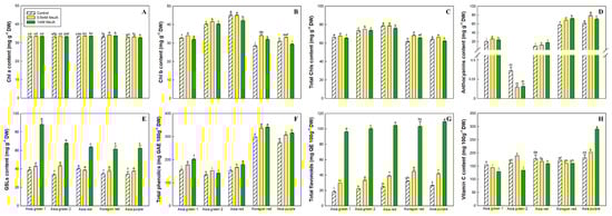 Three freeze-dried microgreen samples of each treatment weighing 1.0 g were mixed with 10 mL of 5% meta-phosphoric acid and homogenized for 1 min. The homogenized sample was centrifuged (14,000× g for 10 min) and the liquid layer of extracts was membrane-filtered (0.22 µm) and analyzed by HPLC as described by [26] using a ZORBAX Eclipse XDB-C18 (4.6 × 250 mm, 5 µm, Agilent, Santa Clara, CA, USA) column and detector (UV-2075, Jasco, Tokyo, Japan) at 265 nm. The mobile phase (methanol to 0.1 M KH2PO4 in 1:9 ratio) was injected at a volume of 20 µL and flowed at a rate of 1 mL min−1.