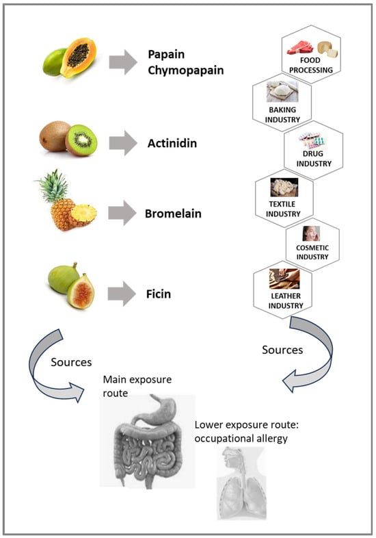This figure also highlights that the exposure to these proteases can occur not only through the consumption of the plant food sources. In fact, PLCPs can be present, sometimes unexpectedly, in several other products, such as meat, cheese, bread, textile tissues and drugs. This occurrence might represent a risk for some people suffering from pathological reactions to these proteases because they are exposed to hidden molecules. However, food PLCPs can also be inhaled, due to exposure to airborne particles. Therefore, the breathing system could also be exposed to these proteases, although to a lesser extent compared to the gastrointestinal tract, and could mainly represent an occupational occurrence.
