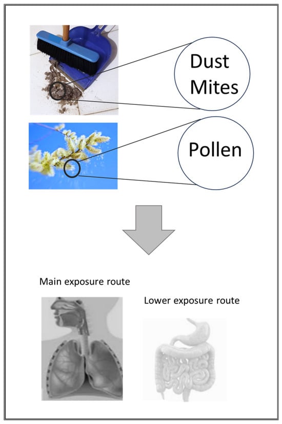 HDM include several species of arthropods feeding on dead human skin cells and thrive in warm, humid environments. They belong to the order Astigmata with around 60 families. The most important are: Pyroglyphidae, Acaridae and Glycyphagidae. The Pyroglyphidae family dominates the domestic fauna with four species: Dermatophagoides farinae (American house dust mite), Dermatophagoides pteronyssinus (European house dust mite), Euroglyphus maynei (Mayne’s house dust mite) and Dermatophagoides microceras. HDM allergen exposure is a major risk factor for the development of persistent allergic respiratory diseases (Figure 2), such as asthma and allergic rhinoconjunctivitis, as well as symptoms such as atopic dermatitis [81].