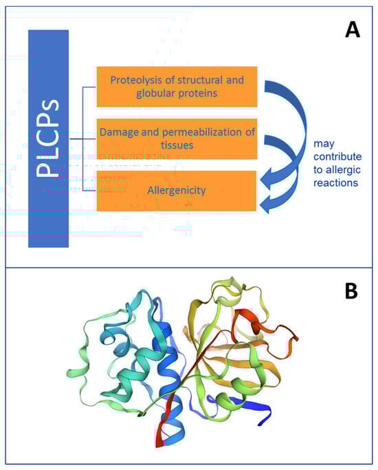 Studies have pointed out that proteolytic activity associated with PLCPs may contribute to their allergenicity (Figure 3A), or to the allergenicity of other proteins, working like adjuvants [39]. This observation, together with the knowledge that plant and/or animal PLCPs can be found not only in natural sources but can be present in additional products, including foods, cosmetics, drugs and supplements, highlights the high relevance of these enzymes for industry and for health.