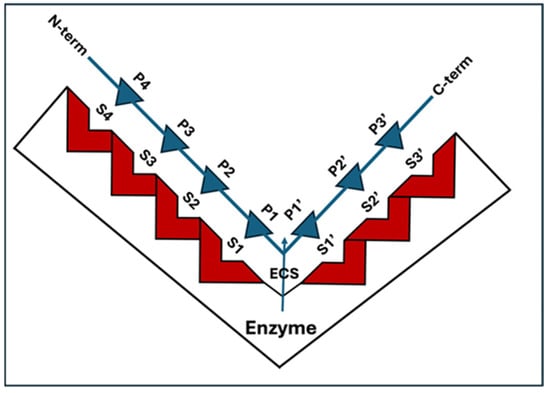 Schematic representation of a model of the complex PLCP substrate proposed by Schechter and Berger [48]. The binding cleft of the enzyme is composed of seven subsites, indicated as S1–S4 and S1′–S3′, located on both sides of the catalytic site. The enzyme cleavage site (ECS) is shown. The positions, P1–P4 and P1′–P3′, on the substrate are counted from the cleavage point with the same numbering as the subsites of the enzyme they occupy.