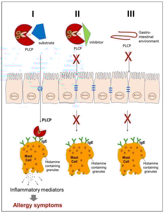 The first event occurs when a working PLCP molecule reaches the epithelial tight junctions and disrupt them [14,59,84]. Then, following tissue permeabilisation, the proteases reach the mast cell, bind the exposed specific IgE and induce the release of inflammatory mediators, which activate the allergic reaction. This event can be triggered by inhaled PLCPs, which derive either from mites [66,148] or from plant foods [9,106], in the case of occupational exposures. However, the first event can also be induced by food PLCPs when they are resistant to gastrointestinal inactivation. In the second possible event, the allergic reaction is not triggered because PLCP enzyme activity is neutralized by a specific inhibitor [53,149]. In the third case, PLCP is denatured and/or fragmented in the gastrointestinal environment [19,33,37]. In both the second and third event, the protease is inactivated, thus preventing the tissue damage and the transit of molecules capable of inducing an allergic reaction.