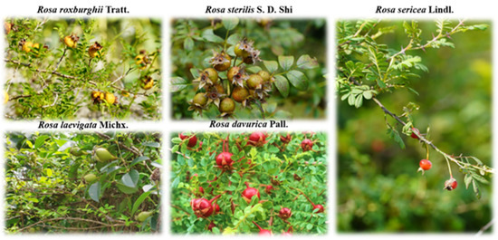 Rosa roxburghii Tratt. is native to China and is mainly distributed in the mountainous areas at an altitude of 1000–1600 m, particularly in the karst areas of Guizhou province [4]. The cultivation area of R. roxburghii has expanded and is estimated to exceed 140,000 ha in Guizhou province by 2021, and the output value of R. roxburghii fruit (RRT-F) is CNY 520 million (http://www.chinanews.com.cn/cj/2022/01-02/9642987.shtml, accessed on 2 January 2022). RRT-F is popular for the highest contents of vitamin C (Vc) and superoxide dismutase (SOD) among other common fruits [5]. Modern pharmacological studies have shown that RRT-F has antioxidant, antimutagenic, anti-atherogenic, and antitumor effects, along with genoprotective and radioprotective activities [6]. Rosa sterilis S. D. Shi was first discovered 30 years ago in Anshun, Guizhou province, China; it was explored by Shengde Shi in 1985 [6]. Previous studies based on ITS sequence analysis proposed that R. sterilis is a natural hybrid of R. roxburghii and R. longicuspis [7]. However, the latest comparative genomics research results indicated that R. sterilis and R. roxburghii are two independent species, and there is a closer genetic relationship between R. sterilis and R. kweichowensis [8]. As a novel fruit resource, R. sterilis fruit (RSS-F) exhibited high nutritional value and a broad market prospect [9]. The components of R. sterilis showed antioxidant, immunity-promoting, anticancer, and anti-aging effects [10,11]. Rosa laevigata Michx., unique to China, commonly known as the “Jin-Ying-Zi” in Chinese, is an evergreen climbing shrub prevalent in the southern regions of China. Its fruits were documented in the Chinese Pharmacopoeia and are mainly used for the treatment of nocturnal emission, nocturnal enuresis, frequent urination, metrorrhagia, and diarrhea [12]. Moreover, as a recognized functional and health food in Asian countries, the fruit of R. laevigata (RLM-F) has been developed as a third-generation wild fruit by the Ministry of National Health of China [13,14]. Rosa davurica Pall., a deciduous shrub, is mainly distributed in northeastern China, Korea, Japan, southeastern Siberia, and eastern Asia. R. davurica fruit (RDP-F) is generally used as a traditional medicine in many countries such as China, Korea, and Japan [15,16,17]; however, only in China is it widely used in food. The health-promoting effects of R. davurica, such as its antioxidant, anti-inflammatory, antiviral, and hypoglycemic activities, are well-established [17,18,19,20]. R. davurica fruit (RDP-F) is also commonly consumed as a beverage and health food in China [21]. Rosa sericea Lindl., commonly known as the silky rose, is mainly distributed in southwestern China {Guizhou, Sichuan, Xizang, and Yunnan} and India, Bhutan, Nepal, and Myanmar [22]. The fruit and root of R. sericea, also called “Shancili,” have been used as traditional medicine to treat abdominal distention, diarrhea, chronic dysentery, menorrhagia, and metrorrhagia in China [23]. R. sericea fruit (RSL-F) is also consumed in southwestern China as a foodstuff; it is nutrient-rich and exhibits great potential as a health food.