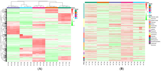 (A) The HCA heat map analysis of Rosa samples with clustering and (B) with compound classifications. The color indicates the level of accumulation of each metabolite, from low (green) to high (red). GC_1, RRT-F; GC_2, RSS-F; GC_3, RLM-F; GC_4, RDP-F; GC_5, RSL-F.