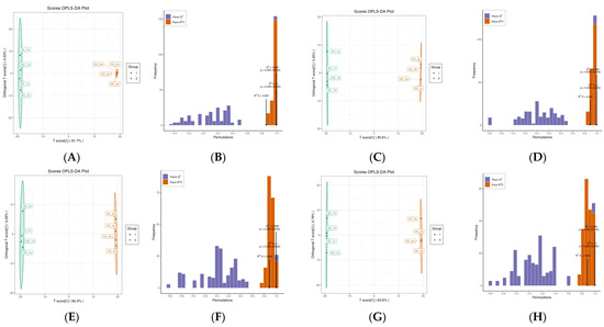 (A,C,E,G) Score plot generated from orthogonal partial least squares discriminant analysis (OPLS-DA), and (B,D,F,H) OPLS-DA models of five samples. (A,B) RRT-F vs. RSS-F; (C,D) RRT-F vs. RLM-F; (E,F) RRT-F vs. RDP-F; (G,H) RRT-F vs. RSL-F.