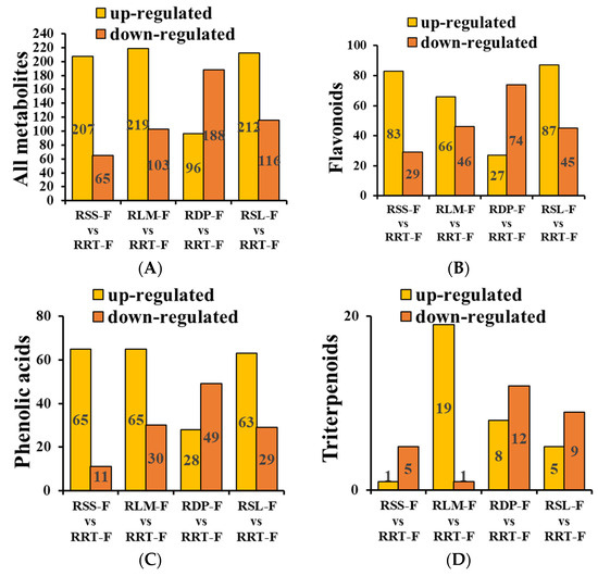 (A) The upregulated and downregulated metabolites from Rosa sterilis fruit (RSS-F), Rosa laevigata fruit (RLM-F), Rosa davurica fruit (RDP-F), and Rosa sericea fruit (RSL-F) compared with Rosa roxburghii fruit (RRT-F). (B) The upregulated and downregulated flavonoids, (C) phenolic acids, and (D) triterpenoids from RSS-F, RLM-F, RDP-F, RSL-F compared with RRT-F.