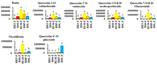 Comparing the relative contents of differentially expressed flavonoids with the highest total content in five rose hips based on their peak area. Kaemp 3-Glu, kaempferol 3-O-β-d-(6″-O-(E)-p-coumaroyl) glucopyranoside; 6-hydroxy l-7-O-Glu, 6-hydroxykaempferol-7-O-glucoside. Different letters on the bars represent significant differences between Rosa fruits samples (p < 0.05) analyzed via a post hoc Tukey’s test.