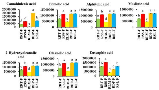 Comparing the relative contents of differentially expressed terpenoids with the highest total content in five rose hips based on their peak area. Different letters on the bars represent significant differences between Rosa fruits samples (p < 0.05) analyzed via the post hoc Tukey’s test.