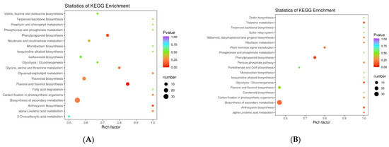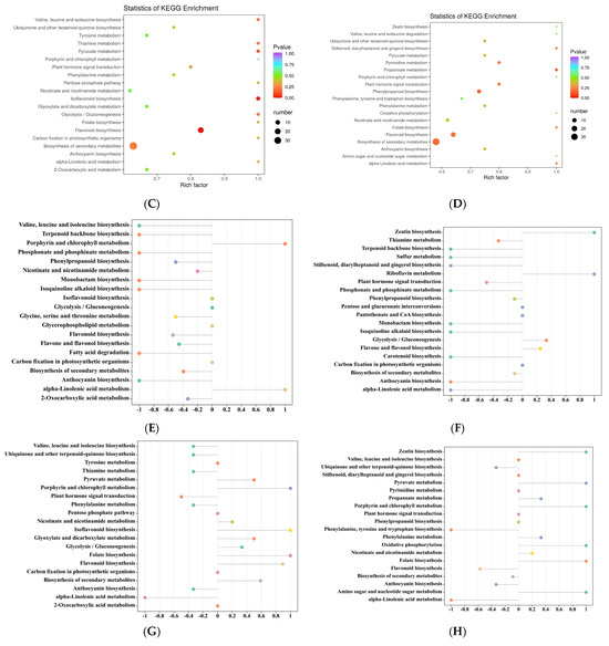 There were 120 metabolites annotating five pathways between RSS-F and RRT-F. The KEGG pathway types with the highest number of annotated metabolites were metabolic pathways, the biosynthesis of secondary metabolites, flavonoid biosynthesis, flavone and flavonol biosynthesis, and phenylpropanoid biosynthesis pathways which accounted for 67.21, 54.10, 21.31, 18.03, and 13.11%, respectively. In addition to the metabolic pathways and biosynthesis of secondary metabolites, flavone and flavonol biosynthesis demonstrated the highest richness factors (Figure 10A). The rich factor was the ratio of the number of differentially expressed genes to the total number of annotated genes in a given pathway. The larger the rich factor, the greater the degree of enrichment [51]. As shown in the differential abundance score map (Figure 10E), the porphyrin and chlorophyll metabolism and alpha-linolenic acid metabolism pathways were significantly upregulated in RSS-F, compared with those in RRT-F. However, the enrichment level was relatively low, owing to fewer annotated metabolites.