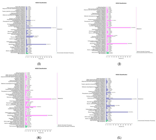 A total of 122 metabolites were annotated in 48 pathways between the RRT-F and RSL-F groups. The pathways with the highest number of annotated metabolites were the metabolic pathways and the biosyntheses of secondary metabolites, flavonoids, phenylpropanoid, and flavone and flavonols, with proportions of 63.08, 53.85, 21.54, 12.31, and 10.77%, respectively. Information on the other metabolic pathways is shown in Figure 10I,J. Nine metabolic pathways were significantly upregulated in the RSL-F group, compared to those in the RRT-F group. In contrast, the biosynthesis pathways for ubiquinone and others like terpenoid-quinone, phenylalanine, tyrosine, and tryptophan, flavonoids, and anthocyanins, along with the alpha-linolenic acid metabolism pathway, were significantly downregulated in RSL-F. The biosyntheses of phenylpropanoids and secondary metabolites showed relatively higher rich factors (Figure 10D,H).