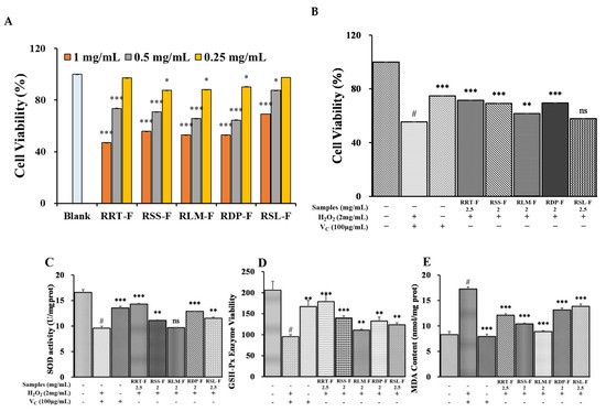 The CCK-8 assay was performed to determine the effects of the five fruit extracts on HaCaT keratinocyte viability at three different concentrations [52]. The results in Figure 11A show that, at concentrations < 0.25 mg/mL, the viabilities of RRT-F and RSL-F cells were not significantly different from that of the control. In contrast, 0.2 mg/mL of RSS-F, RLM-F, and RDP-F exhibited low cytotoxicity. Therefore, 0.25 mg/mL of RRT-F and RSL-F and 0.2 mg/mL of RSS-F, RLM-F, and RDP-F extracts were used in all subsequent experiments.