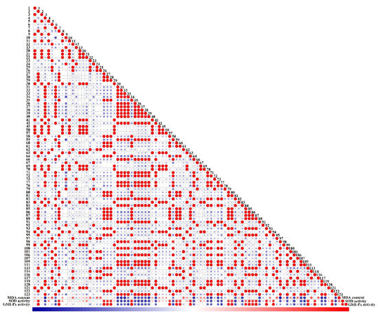 Correlation index between antioxidant activities and the potential markers (flavonoids and phenolic acids). The numbers represent the compounds in Supplementary Table S5. The red color indicates the positive correlation, the blue color indicates the negative correlation, and the blank represents no correlation. The size of the circle represents the significance of the corresponding correlation.