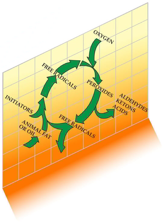 Numerous potential initiators and propagators of lipid peroxidation in muscle foods are recognised, including the hydroxyl radical (HO·), perferryl and ferryl radicals, Fe2+-O2-connected radicals, and porphyrin cation radicals (P-Fe4+ = O). Additionally, enzyme systems such as lipoxygenases, cyclooxygenases dependent on nicotinamide adenine dinucleotide phosphate (NADPH), adenosine diphosphate–Fe3+ (ADF–Fe3+) and O2 enzymes play a role in this process [5]. The complete understanding of which form of iron—free or connected, haem or non-haem, oxidised or reduced—possesses the capacity to oxidise polyunsaturated fatty acids in meat remains elusive [3]. A pivotal aspect of lipid peroxidation revolves around identifying the primary catalysts that initiate and propagate the process (Figure 1) [1], along with recognising its cyclic nature (Figure 2) [3].