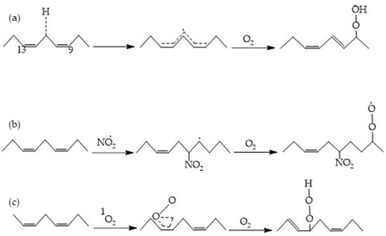Initiation of lipid peroxidation: (a) by separation of hydrogen; (b) by free radicals attacking a double bond; (c) by singlet oxygen in the so-called “en” reaction (adapted by Kanner [7] Copyright year 1994, Elsevier).