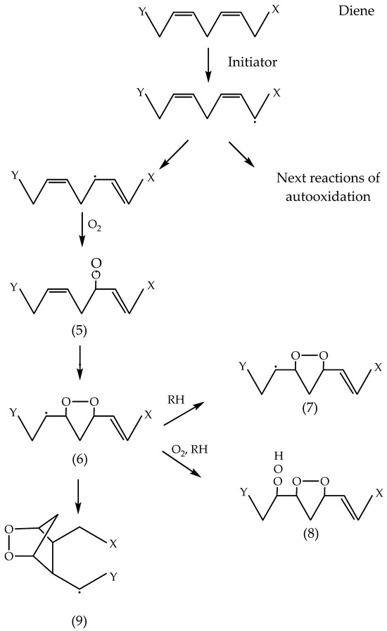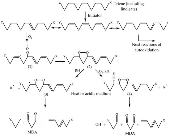The radical compound (1) can cyclise and form a five-atomic cyclic peroxide radical compound (2), which is capable of extracting hydrogen from the alkyl group and forming compound (3) or undergoing peroxidation by releasing hydrogen and forming compound (4). Compounds (3) and (4) may form MDA in an acidic medium or through heat treatment (Dahle et al. [78]). Thus, the proposed mechanism does not include the release of the initial hydrogen atom and subsequent formation of peroxyl radicals in the allylic positions at the ends of the diene system, as indicated in Figure 5.