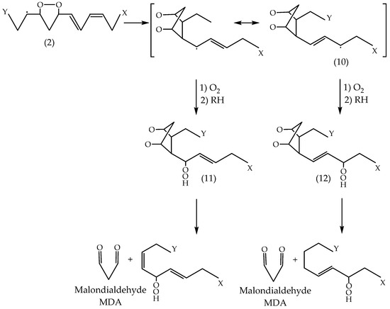 Pryor et al. [79] offer a modification of the mechanism proposed by Dahle et al. [78] for a more adequate explanation of the formation of MDA by PUFA (Figure 6). Compound (2), whose formation is shown in Figure 4, undergoes a cyclical closure (ring formation) and produces cyclic endo peroxyl radical compound (10), which subsequently undergoes peroxidation and the release of alkyl hydrogen, resulting in compounds (11) and (12). MDA forms when any one of these compounds is exposed to heat or acid. In the diene system, compound (6) forms a double cyclic endo peroxyl radical (9) (Figure 5).