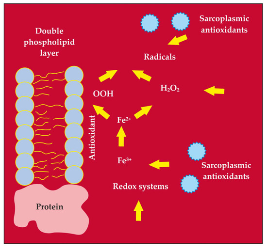 The superoxide anion radical (O2−·) is not reactive enough to abstract a proton from lipids, although it can lead to the formation of H2O2. The peroxide anion radical can be produced through various enzymatic reactions in mitochondria, microsomes, and sarcoplasm, where its substrates are present [11]. It is an important precursor for the generation of hydroxyl radicals, which can initiate lipid peroxidation. Simple iron complexes (Fe2+.ADP and their salts) can react with H2O2 to form a hydroxyl radical (HO·), which initiates lipid peroxidation by extracting hydrogen from another lipid radical. In this way, the chain reaction spreads. It is accepted that until iron is released from heme proteins, they cannot react with H2O2 or the superoxide anion radical (O2−·) to form hydroxyl radical (HO·). To initiate the lipid peroxidation process, iron has to be liberated from these proteins [11].