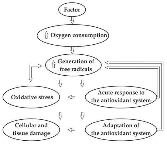 The electron structure of oxygen comprises two non-binding electrons of π anti-binding energy level in a triplet state 3Σg. Consequently, the reaction of oxygen with molecules in a singlet multiple basic state 1Σg, such as PUFA, is precluded by a spin (Table 1). This limitation does not apply to reactions involving single electrons, hydrogen atoms, or other atoms and molecules containing unrelated electronic pairs, such as metals with variable valence or free radicals [1,13]. The reduction in oxygen with four electrons to water results in a highly positive potential (E0 = +0.82 V vs. NHE at pH 7.0). The conversion of this potential through one-electron reduction processes yields various products, including superoxyl anion radical (O2−·), hydroperoxyl radicals (HO2−·), hydrogen peroxide (H2O2), and hydroxyl radicals (HO·) [13,24,83]. The theory of molecular orbitals elucidates the presence of triplet oxygen in a basic state with a double bond. Peroxyl radicals (LOO·) exhibit similar bonds but with only one unrelated electron of anti-binding π level. The addition of hydrogen with an affiliated proton or hydrogen atom to oxygen results in the formation of hydroperoxyl radicals (HO2−·) or hydrogen peroxide (H2O2). They manifest π binding, and by hybridisation sp3—sp3, two additional σ-bonds are formed [13,83,84]. In this scenario, oxygen undergoes p3 hybridisation and possesses two pairs of unpaired valence electrons.