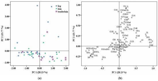 (a) Score plot of pork cuts investigated (leg, loin, and tenderloin) using the first two principal components (PC1 and PC2); (b) loading plot of analyzed variables obtained using PC1 and PC2, explaining a total variance of 41.9%.