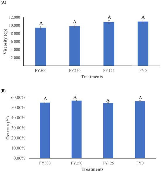 (A) Viscosity of the frozen yogurt mixes with hesperidin added before freezing in the batch freezer. (B) Overrun measurements in frozen yogurt with added hesperidin. FY500 = frozen yogurt with 500 mg of hesperidin per 90 g serving. FY250 = frozen yogurt with 250 mg of hesperidin per 90 g serving. FY125 = frozen yogurt with 125 mg of hesperidin per 90 g serving. FY0 = frozen yogurt without added hesperidin. A bars not containing a common letter are significantly (p < 0.05) different.