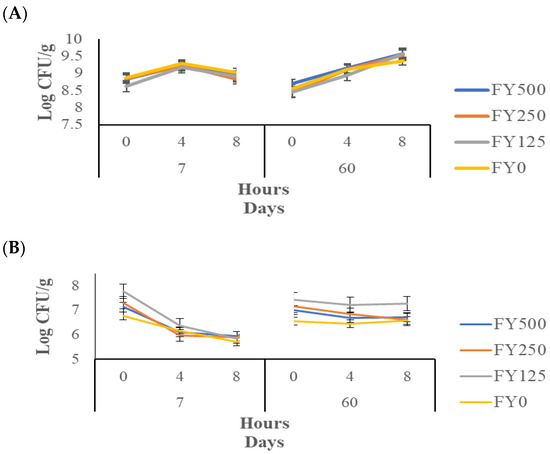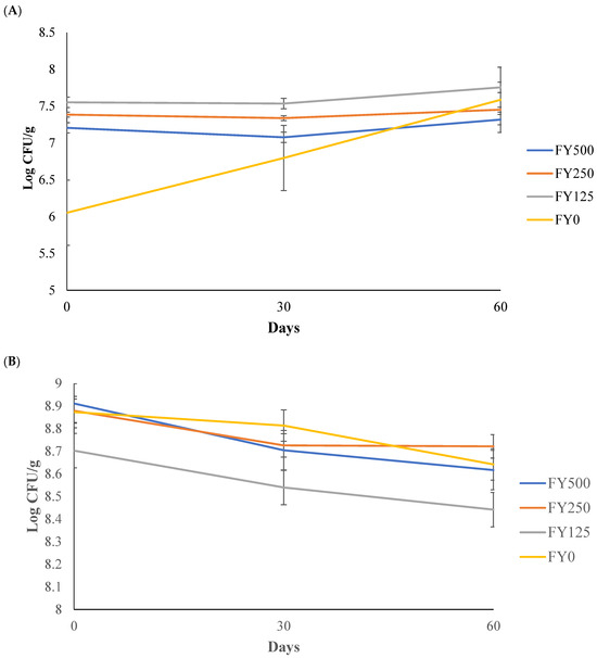 (A) L. bulgaricus counts in frozen yogurt with added hesperidin over 60 d of storage. (B) S. thermophilus counts in frozen yogurt with added hesperidin over 60 d of storage. FY500 = frozen yogurt with 500 mg of hesperidin per 90 g serving. FY250 = frozen yogurt with 250 mg of hesperidin per 90 g serving. FY125 = frozen yogurt with 125 mg of hesperidin per 90 g serving. FY0 = frozen yogurt without added hesperidin.