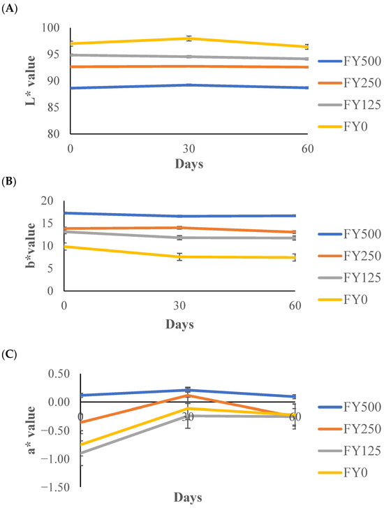 The L* (A), b* (B) and a* (C) values of frozen yogurt with added hesperidin over 60 d of storage. FY500 = frozen yogurt with 500 mg of hesperidin per 90 g serving. FY250 = frozen yogurt with 250 mg of hesperidin per 90 g serving. FY125 = frozen yogurt with 125 mg of hesperidin per 90 g serving. FY0 = frozen yogurt without added hesperidin.