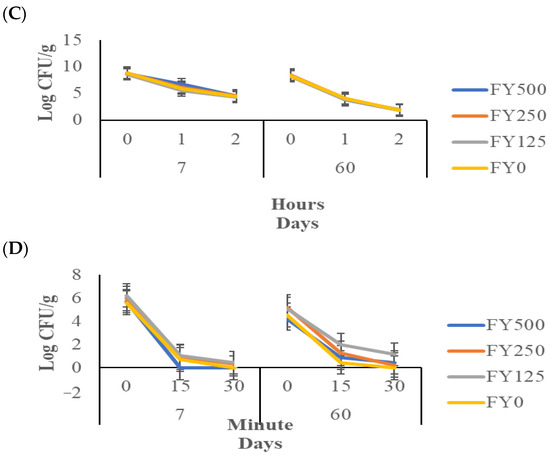 The results for the bile tolerance of L. bulgaricus are shown in Figure 5B. The hour effect, day effect and day × hour effect were significant (p < 0.05), while the remaining effects were not significant (p > 0.05). From d 7 to d 60, an increase was observed for the L. bulgaricus counts after 4 and 8 h of incubation.