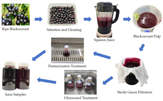 Completely mature and high-grade blackcurrants were harvested from Jixi (45°17′42″ N, 130°58′08″ E, altitude 230 m), Heilongjiang Province, China. After cleaning with distilled water, the blackcurrant fruit and drinking water were blended at a ratio of 1:1 and transferred to an electric juicer (MJ-PB12 Easy 219, Midea Group Co., Ltd. China) for approximately 30 s to produce blackcurrant pulp. Then, the fruit juice was filtered through four-layered sterile gauze (Jianerkang, Medical Technology Co., Changzhou, Jiangsu, China), and then it was divided into three parts for different treatments: untreated or raw juice (RJ), pasteurized juice (PJ), and thermosonicated juice (TJ).