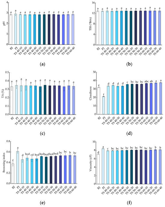 Effects of different treatments on the physicochemical properties of blackcurrant juice: (a) pH; (b) TSS; (c) TA; (d) cloudiness; (e) browning index; (f) viscosity. Different letters indicate significant (p < 0.05) differences between treatments.