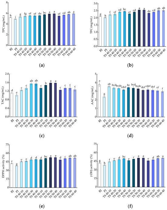 Effects of treatments on bioactive compounds in blackcurrant juice: (a) TPC; (b) TFC; (c) TAC; (d) AAC; (e) DPPH; (f) (·OH). Different letters indicate significant (p < 0.05) differences between treatments.