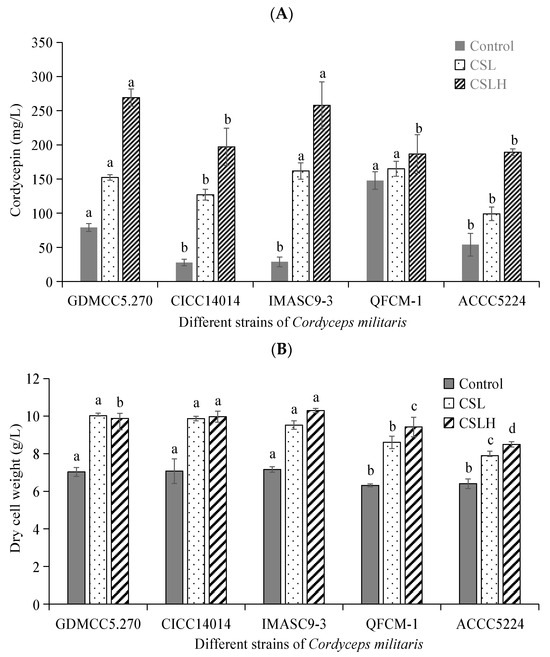 Effect of CSL and CSLH on cordycepin production (A) and mycelium growth (B) of C. militaris. The culture was performed at determined conditions (pH 6.5 at 25 °C and 120 r/min for 8 days). Different lowercase letters (a, b, and c) indicate that different experimental groups have significant differences (p < 0.05) in the same strain. Each error bar represents 1 standard deviation.