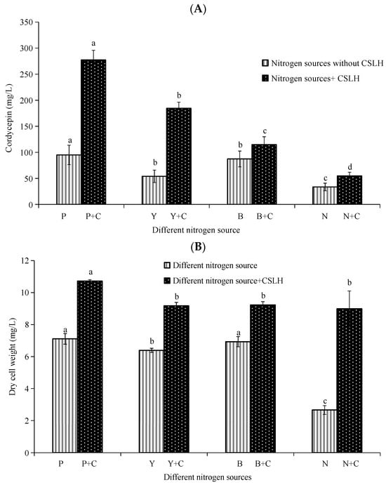 Effect of different nitrogen sources on cordycepin production (A) and mycelium growth (B) of C. militaris GDMCC5.270 (P: peptone 5.0 g/L, Y: yeast extract 5.0 g/L, B: beef paste 5.0 g/L, N: (NH4)2SO4 5.0 g/L. P + C: peptone 3.0 g/L + CSLH 2.0 g/L, Y + C: yeast extract 3.0 g/L + CSLH 2.0 g/L, B + C: beef paste 3.0 g/L+ CSLH 2.0 g/L, N + C: (NH4)2SO4 3.0 g/L + CSLH 2.0 g/L. The culture was performed at determined conditions (pH 6.5 at 25 °C and 120 r/min for 8 days). Different lowercase letters (a, b, and c) indicate that the same experimental groups have significant differences (p < 0.05) in different nitrogen sources. Each error bar represents 1 standard deviation.