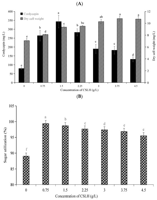 Effect of CSLH concentration on cordycepin production, mycelium growth, and sugar utilization by C. militaris GDMCC5.270 (A,B). The fermentation medium contained 10 g/L glucose, 5.0 g/L mixed nitrogen sources (0.75~4.5 g/L corn steep liquor hydrolyzate and 0.5~5.0 g/L peptone), 0.6 g/L KH2PO4, and 0.5 g/L MgSO4. Bars followed by different letters are significantly different from each other at p < 0.05, according to Tukey’s HSD. Each error bar represents 1 standard deviation.