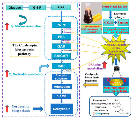 The biosynthesis pathway of cordycepin is described in Figure 4. Cordycepin was produced by the regulation of some key amino acids, such as aspartate, glutamic acid, glycine, alanine, and valine. Based on the above research and the synthesis pathway of cordycepin, the possible mechanism of CSLH promoting a high level of cordycepin accumulation was preliminarily illustrated. CSLH was rich in glutamine, glycine, alanine, and other small molecular amino acids and peptides, which were conducive to the absorption and metabolism of C. militaris and played a key role in sugar, amino acid, and nucleotide metabolism, increasing the biosynthesis of inosine monophosphate (IMP), and promoting the synthesis of IMP and adenosine, the precursor of cordycepin synthesis. These findings verified the essential role of CSLH in enhancing cordycepin production via gene regulation within these pathways.
