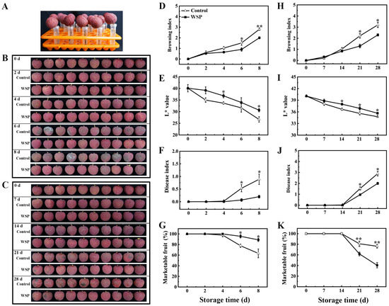 The effects of water supply via pedicel (WSP) treatment on the quality of litchi fruit during storage at 25 °C (B,D–G) and 4 °C (C,H–K). A schematic of the WSP treatment for litchi fruit (A). The appearance changes in litchi fruits treated with WSP stored at 25 °C (B) and 4 °C (C); pericarp browning index (D,H); chromatic L* value (E,I) for the redness of surface; disease index of pericarp (F,J); and marketable fruit rate (G,K). Each value represents the means ± SE of three replicates. Asterisks indicate that the values are significantly different between the WSP treatment and the control fruit at each time point of storage (* p ≤ 0.05, ** p ≤ 0.01).
