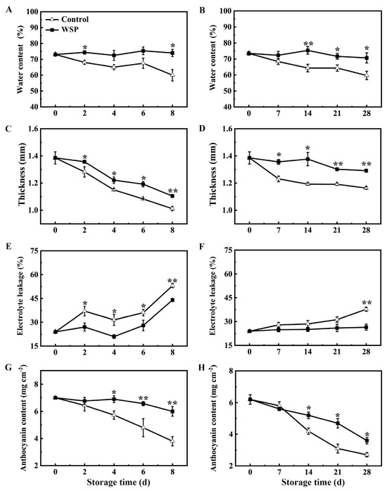 The effects of WSP treatment on the water content (A,B), thickness (C,D), electrolytic leakage (E,F), and anthocyanin content (G,H) in the pericarp of litchi fruit stored at 25 °C (A,C,E,G) and 4 °C (B,D,F,H). Statistical analyses were performed as described in Figure 1. Asterisks indicate that the values are significantly different between the WSP treatment and the control fruit at each time point of storage (* p ≤ 0.05, ** p ≤ 0.01).