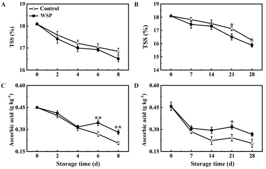 The effects of the WSP treatment on the contents of TSS (A,B) and ascorbic acid (C,D) in aril tissues of litchi fruit stored at 25 °C (A,C) and 4 °C (B,D). Statistical analyses were performed as described in Figure 1. Asterisks indicate that the values are significantly different between the WSP treatment and the control fruit at each time point of storage (* p ≤ 0.05, ** p ≤ 0.01).