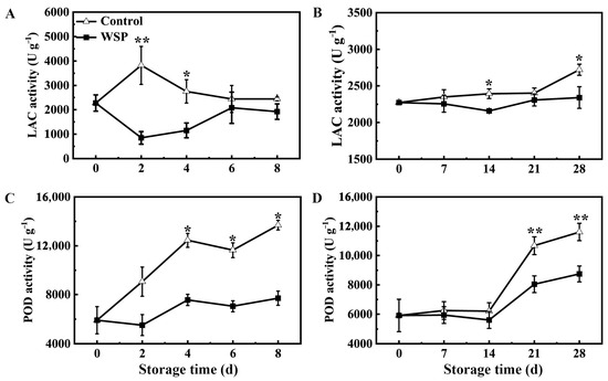 The effects of the WSP treatment on the enzyme activity of LAC (A,B) and POD (C,D) in the pericarp tissue of litchi fruit in 25 °C (A,C) and 4 °C (B,D) storage. Statistical analyses were performed as described in Figure 1. Asterisks indicate that the values are significantly different between the WSP treatment and the control fruit at each time point of storage (* p ≤ 0.05, ** p ≤ 0.01).