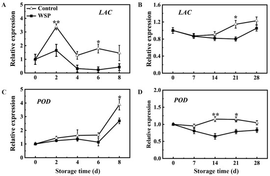 The effects of the WSP treatment on the expression of LAC (A,B) and POD (C,D) genes in litchi fruits during storage at 25 °C (A,C) and 4 °C (B,D). Statistical analyses were performed as described in Figure 1. Asterisks indicate that the values are significantly different between the WSP treatment and the control fruit at each time point of storage (* p ≤ 0.05, ** p ≤ 0.01).