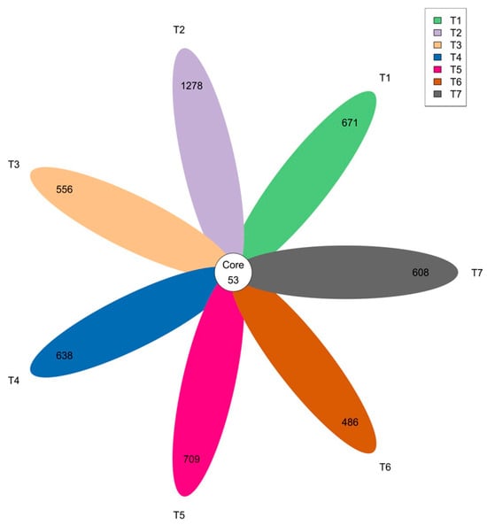 To simplify the workload of species annotation, ASVs were obtained by clustering according to the requirement of 100% sequence similarity, and then the number of common and unique ASVs between different groups was analyzed, as shown in Figure 1. In total, 724, 1,331, 609, 691, 762, 539, and 661 ASVs were obtained from T 1, 2, 3, 4, 5, 6, and 7, respectively. Overall, only 53 ASVs were shared by all the samples, indicating that bacterial diversity between samples was not highly similar. Therefore, it could be concluded that the richness and diversity of microbial composition varied largely across treatments and groups.