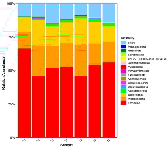 Relative abundances of bacteria at the phylum level of fermented goat meat sausage in different treatments and groups (the top 15 phyla).