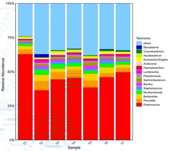The relative abundance of the top 15 bacteria at the phylum level in goat meat sausages is displayed in Figure 2. Firmicutes, Proteobacteria, and Bacteroidota were the predominant phyla and their relative abundances were higher than 10%. Firmicutes was recognized as the most predominant phylum with a relative abundance of over 46.13%, followed by Proteobacteria with a relative abundance of nearly 12.40%, and Bacteroidota with a relative abundance of over 10.98%. Similar results were observed by Wang et al. They found that Firmicutes and Proteobacteria were the dominant phyla with a total proportion of above 90% at all fermentation stages (fermenting 0, 10, 20, 30 days) of Chinese Cantonese sausage [33]. In Figure 3, an analysis of the microbial community at the genus level was performed, and the top 15 genera of microbiota in all the samples were presented. Enterococcus was the most abundant genus, with the relative abundance ranging from 36.38% to 62.88%. Following that, Prevotella and Bacteroides had the relative abundance ranging from 3.03% to 6.71%, and from 2.35% to 4.61%, respectively. In comparison to T 1 with the lowest level of sodium nitrite (150 mg/kg) and glucose (10 g/kg), the relative abundance of Enterococcus was reduced obviously by the elevating levels of the two additives, respectively. Although this image was not fully observed in the sodium chloride group, the relative abundance of Enterococcus was also reduced by increasing sodium chloride from 25 g/kg to 35 g/kg.