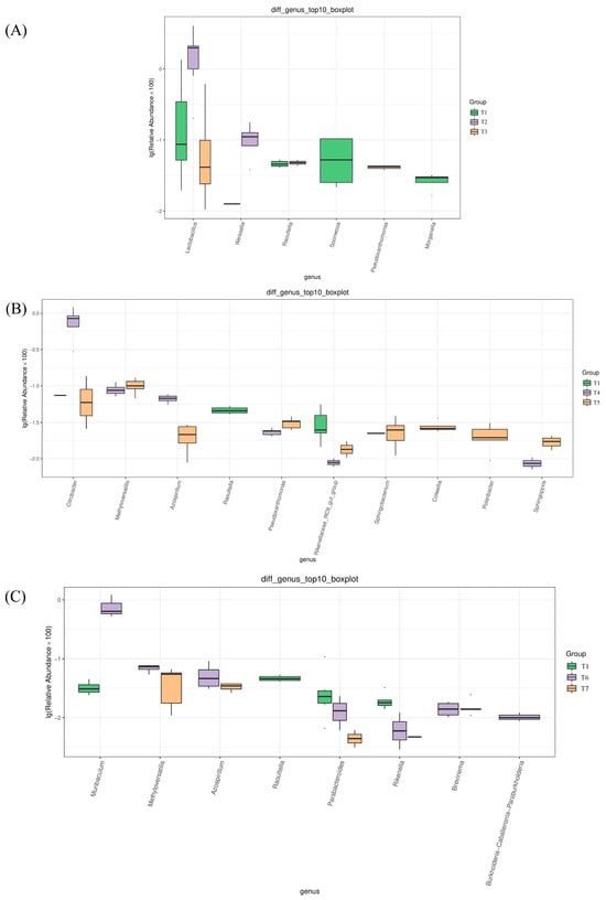 Analysis of differences in bacteria of fermented goat meat sausages at the genus level in different groups through the ANOVA analysis. (A) Sodium chloride group, (B) sodium nitrite group, and (C) glucose group.