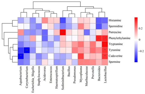 Correlation heatmap of bacterial relative abundance and biogenic amine content * 0.01 < p ≤ 0.05, ** 0.001 < p ≤ 0.01.