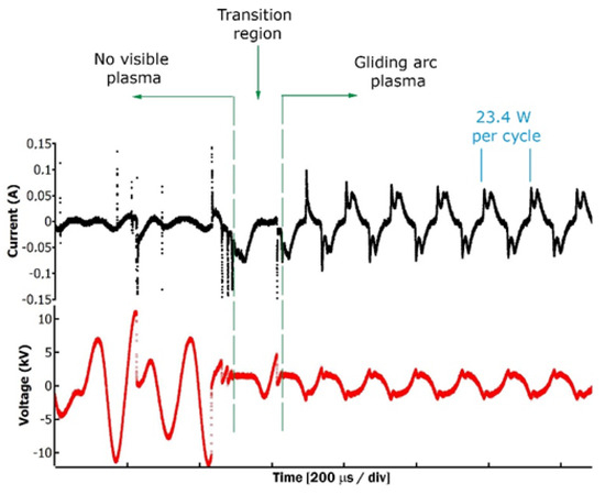 Once operating and prior to a visible plasma discharge appearing, both voltage and current showed variations in roughly random patterns (Figure 2). In this regime, sudden increases in current coincide with sudden voltage drops. Since the operating voltage of each head produces an electric field below the minimum required to induce electrical breakdown in air (Ebreakdown~30 kV cm−1), this observation indicates the random emission of electrons from the cathode without sufficient energy to produce ionization channels in the atmospheric gas [28]. This regime can be characterized as a dark discharge regime, where no visible conduction channels appear. Eventually, a transition region occurs on the operation of the power input, which is followed by a gliding arc plasma observable to the naked eye. The transition from a dark discharge regime to an operating gliding arc regime is enhanced by the augmented electron population and/or small aerosol particles pumped in the interelectrode region. In this regime of continuous plasma operation, which was employed in the following experiment conditions, the average power consumption for plasma production was 23.4 W per cycle.