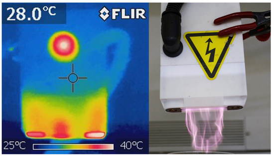 Once operating, the gliding arc plasma can reach between 5 and 10 cm below the system housing, as shown in Figure 3. Furthermore, after 5 min of continuous operation, the temperature of the plastic housing stabilizes at 40 °C and no considerable temperature fluctuations are observed in the surrounding area (Figure 3).