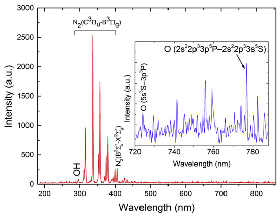 Spectral measurements of the gliding arc discharge during operation are shown in Figure 4. A spectrum was obtained in the 200–850 nm range and showed a variety of emission lines. For example, the insert in Figure 4 shows emission lines from atomic oxygen, since plasma is hot enough to dissociate O2 molecules. Also, molecular bands in the 280–400 nm range are observed, which were further plotted for a better data analysis within this wavelength range (Figure 5). The spectrum includes a combination of two main emission bands, including hydroxyl radicals (OH-) with peaks at 307 nm and 309 nm and molecular nitrogen (N2). According to these spectra, molecular temperatures for OH- and N2 lie in the range 3000–5000 K with electron temperature Te > 8000 K, whereas thermographic images (Figure 3) showed a maximum temperature of the equipment of 40 °C. These results indicate that gliding arc plasma is capable of producing high-temperature chemical reactions while maintaining relatively low temperatures in their surroundings due to the poor thermal conductivity of the plasma components [29].